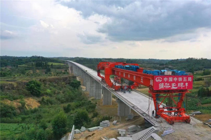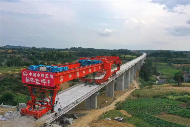 目前,成自高铁全线累计完成箱梁架设75%,预计今年底开始全线铺轨,2023年全线建成通车。