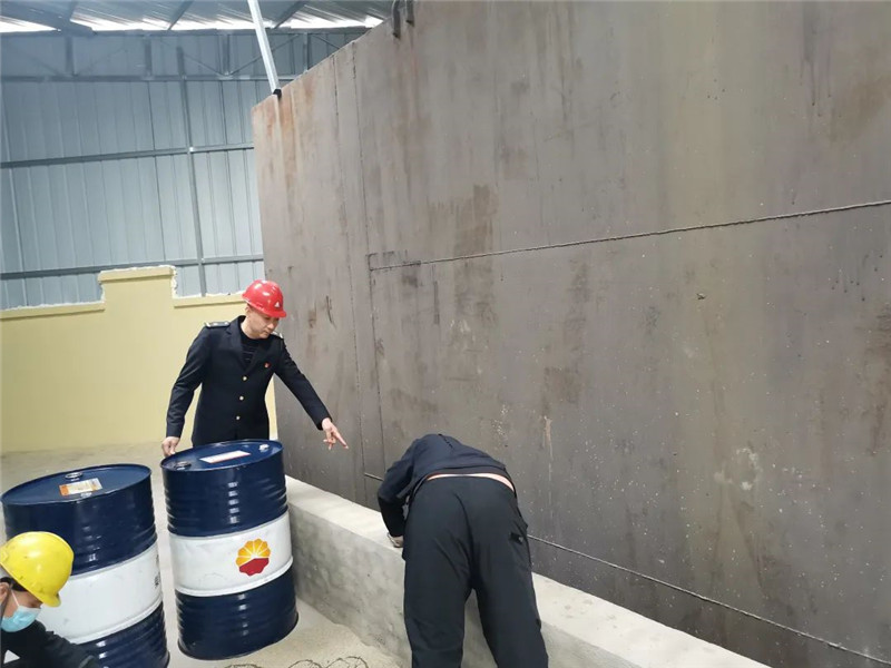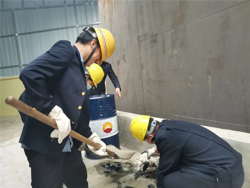 本次应急演练模拟场景为危废暂存间的废油回收桶在移动过程中发生倾倒,废油溢撒,造成了地面严重污染。有关人员立即上报现场情况,启动应急措施。抢险人员到达现场后,第一时间扶起油桶,并安排专人拉设警戒横线,随后用沙土在漏撒废油周围形成围堰,防止流遗扩散,再使用沙子和棉纱吸附清理废油,最后对相关处理物装车运走集中处理,恢复现场秩序。