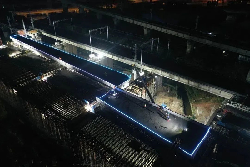12月7日,由蜀道铁路运营集团下属成自铁路公司参与投资的成都至自贡高速铁路(以下简称:成自高铁)成都南联络右线特大桥施工现场,伴随着现场指挥人员的最后确认,经过9小时施工,国内最大道岔连续梁横移顺利完成!标志着成自高铁与成都南站顺利衔接,为年底全线铺轨奠定了坚实基础。
